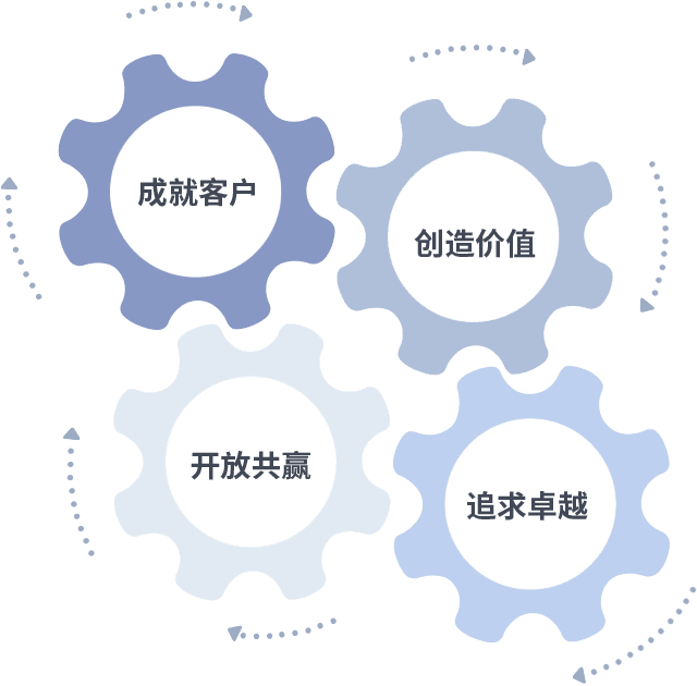 成就客户是一切决策的出发点,,,创造价值是衡量所有工作的标准,,追求卓越是我们做事做人的态度,,,开放共赢是我们的格局也是最终的结果。。。。价值观的齿轮环环相扣,,,,推动着组织里的每个人不断向前。。。